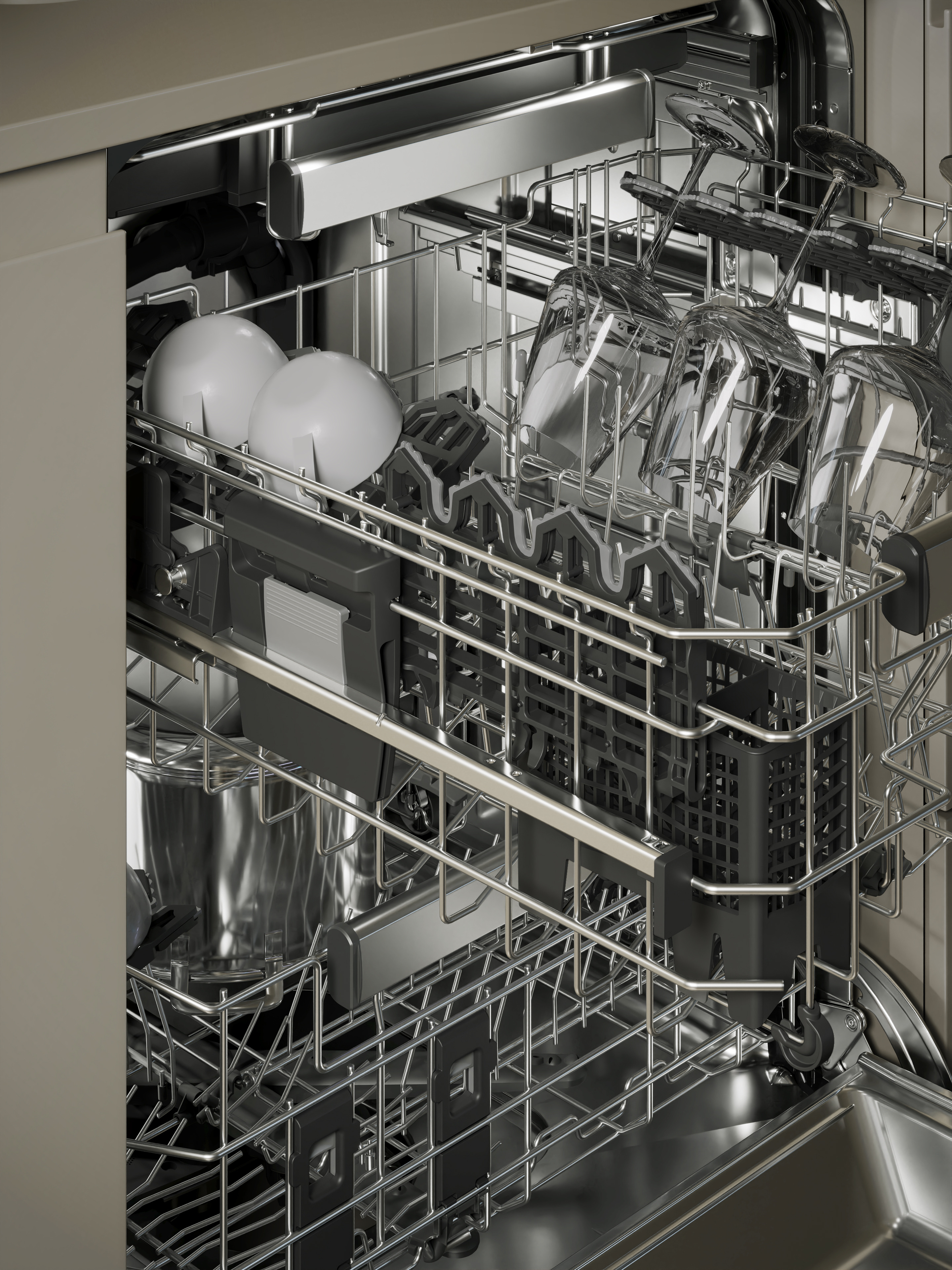 Die Adora Geschirrspüler wurden mit Fokus auf Platz, Komfort und Flexibilität entwickelt und passen sich an jeden Zweck und jedes Bedürfnis an: Sämtliche Arten von Gläsern und Geschirr werden mühelos gereinigt. Die Geschirrkörbe bieten sicheren Halt für Teller, Pfannen und Tassen. Für empfindliches Besteck gibt es eine eigene Schublade. Große, multifunktionale Tassenablagen im Ober- und Unterkorb sorgen dafür, dass die wertvollen Weingläser sicher stehen bleiben. Intelligente Programme kümmern sich um den Rest und sorgen für einen völlig neuen Bedienkomfort.